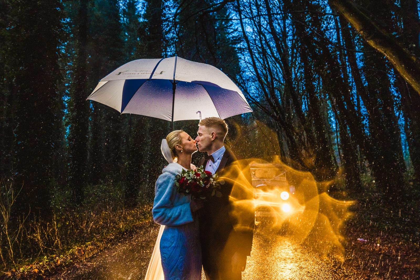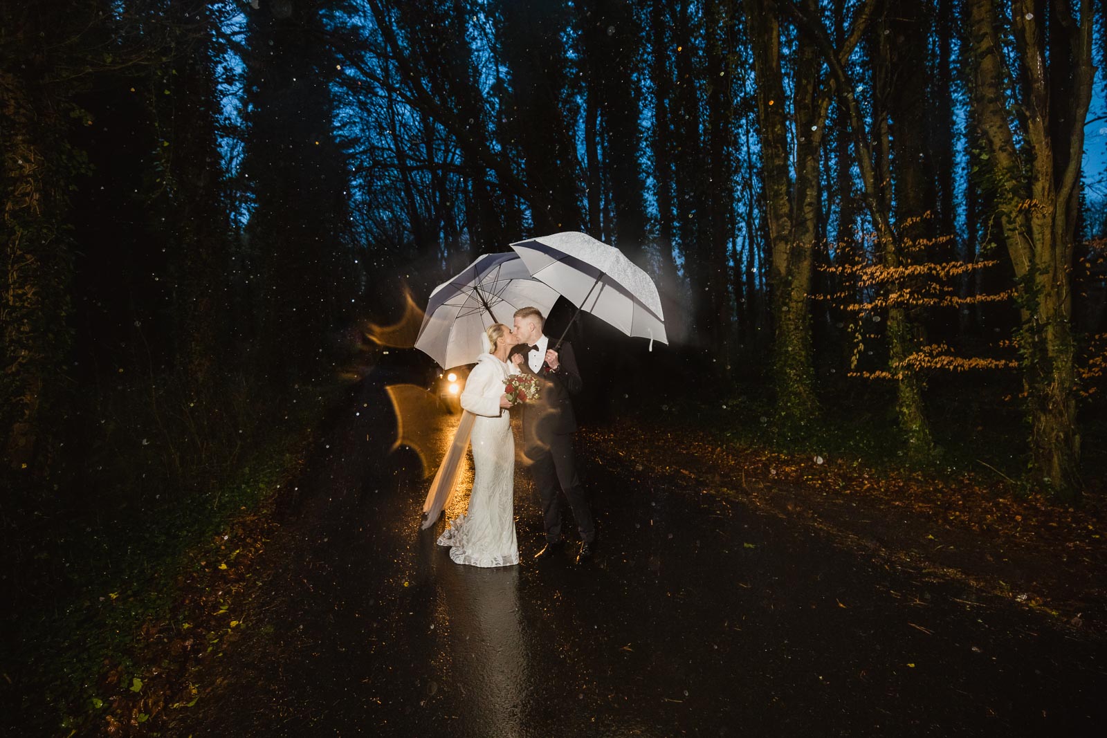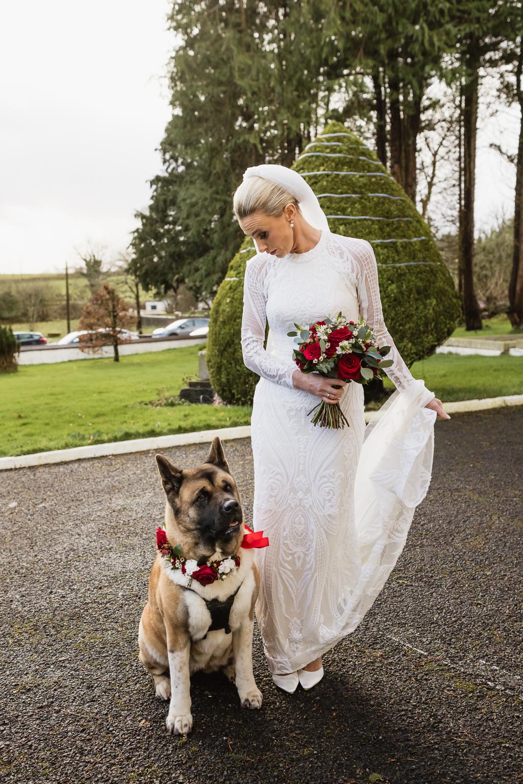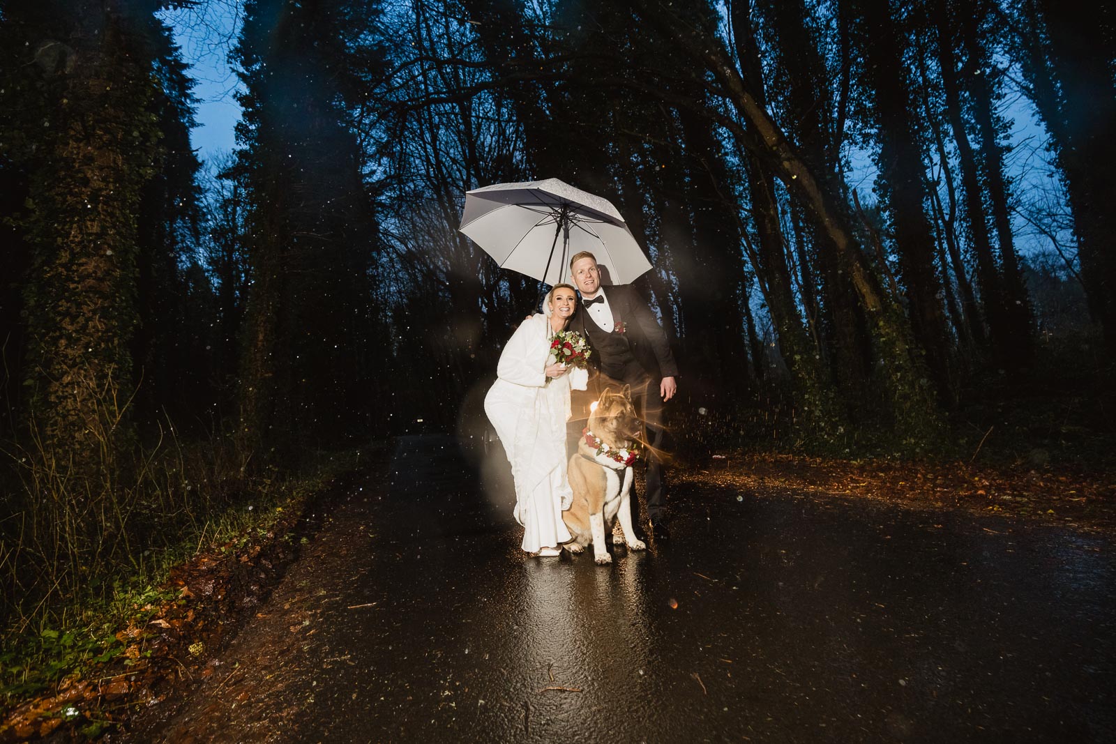 Despite the wild rain, Yvonne and Seaghan, along with their bridal party and their beloved German Shepherd, ventured into Belleek Forest Park for a photoshoot. The group embraced the weather, resulting in joyful moments captured amidst the lush greenery near Belleek Castle. The spirited session led to stunning photographs, some of which received international acclaim.