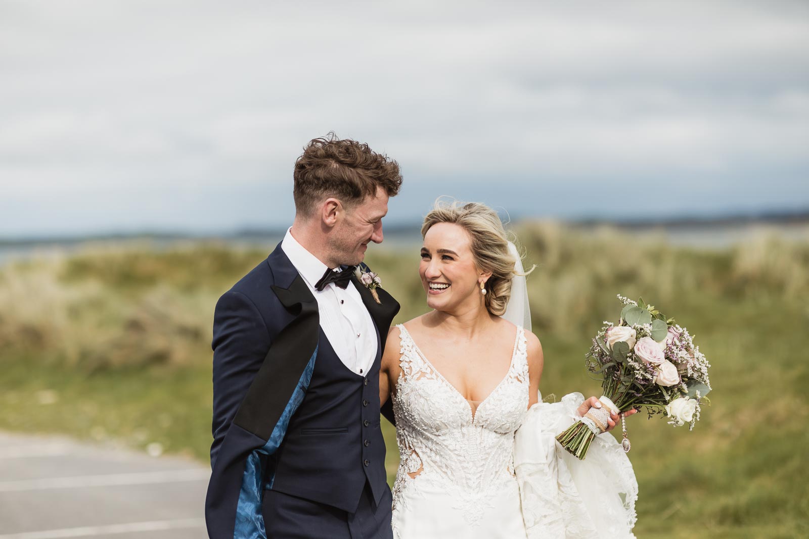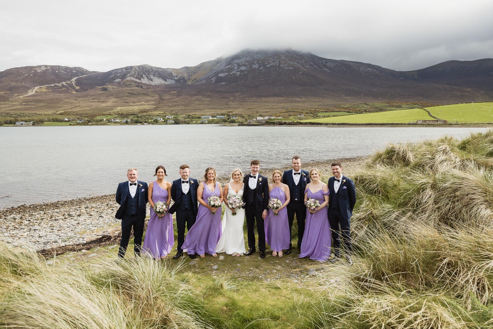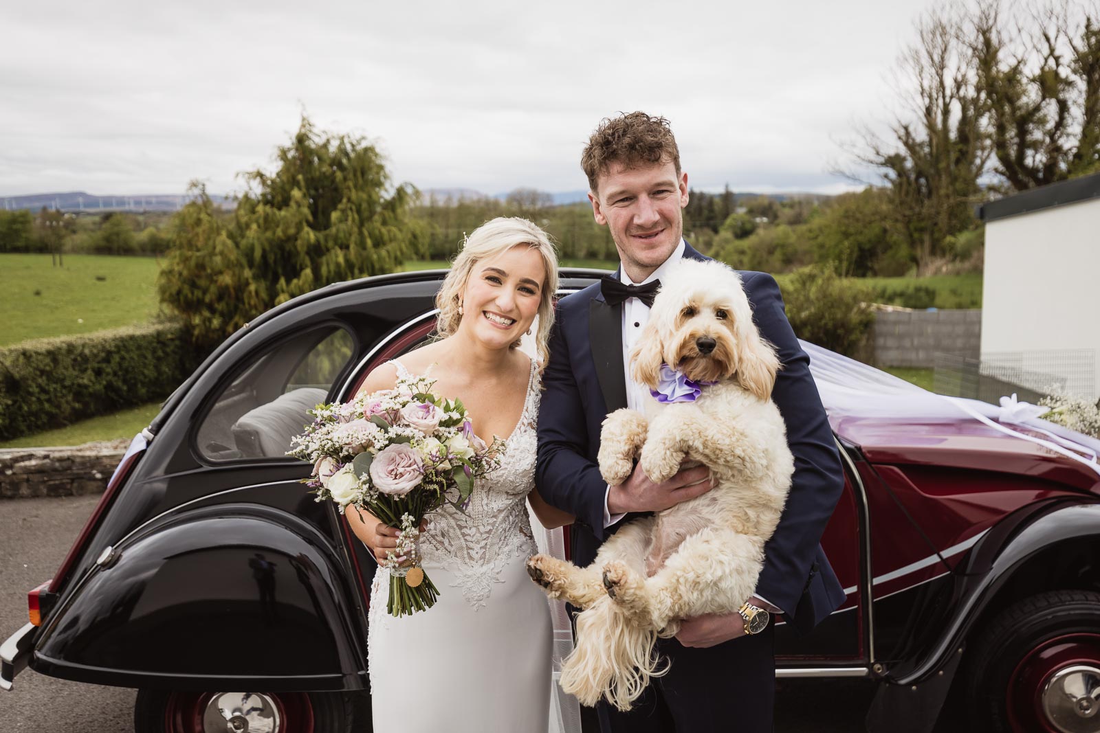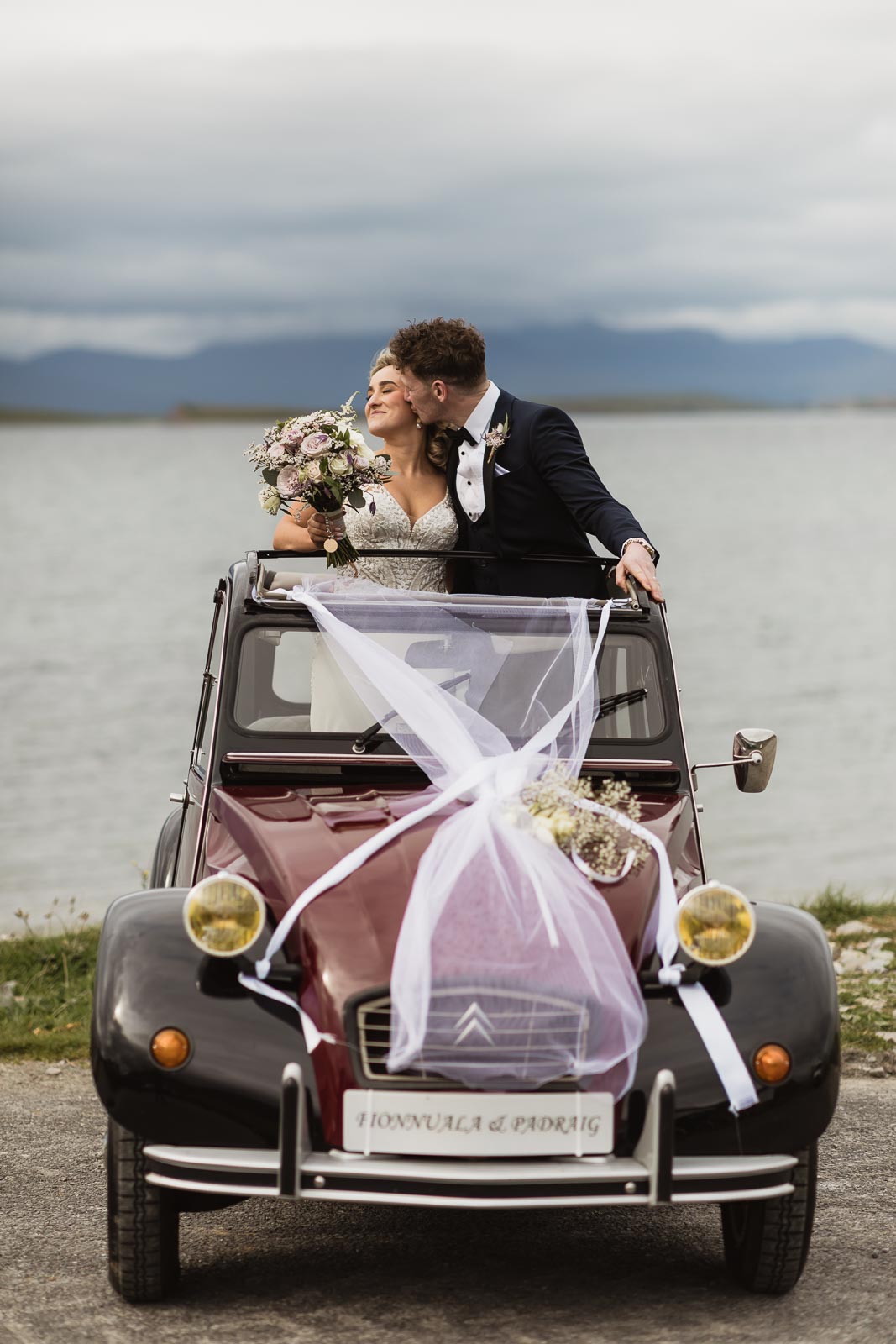 Post-ceremony, Fionnuala and Padraig returned home briefly to include their two cherished dogs in some photographs. The couple then journeyed to Bertra Beach, near Westport in County Mayo, in a vintage open-roof maroon Citroën 2CV6 Charleston. The picturesque setting of sand dunes, ocean vistas, and distant mountains provided a breathtaking backdrop for their photoshoot.