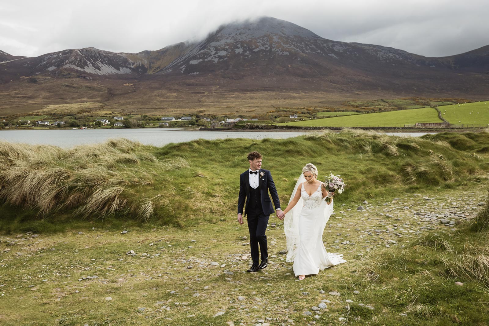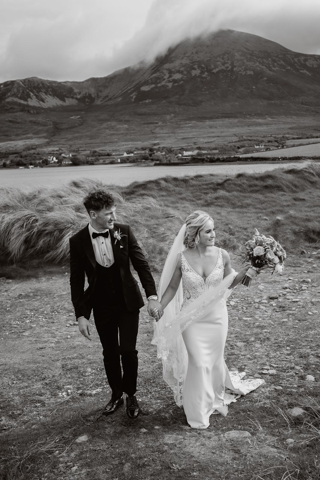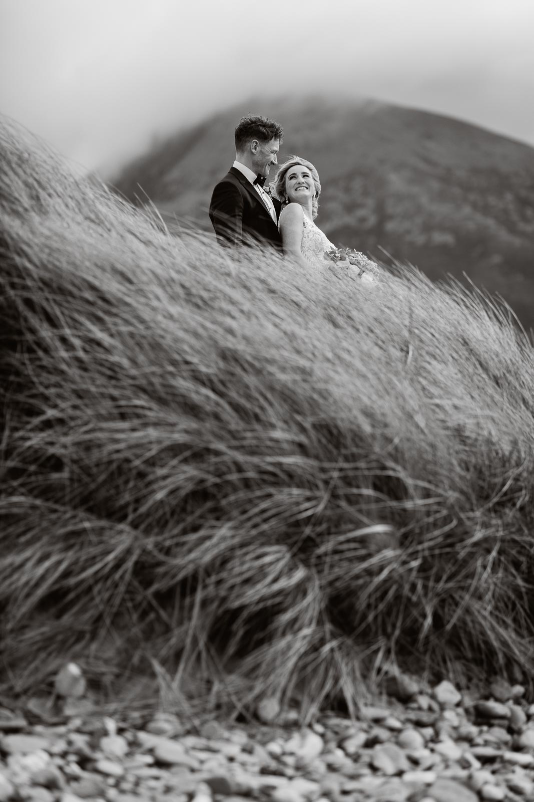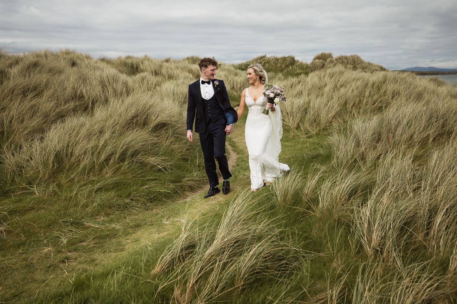 Post-ceremony, Fionnuala and Padraig returned home briefly to include their two cherished dogs in some photographs. The couple then journeyed to Bertra Beach, near Westport in County Mayo, in a vintage open-roof maroon Citroën 2CV6 Charleston. The picturesque setting of sand dunes, ocean vistas, and distant mountains provided a breathtaking backdrop for their photoshoot.