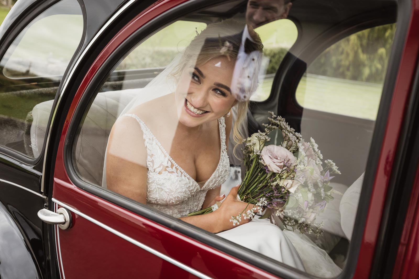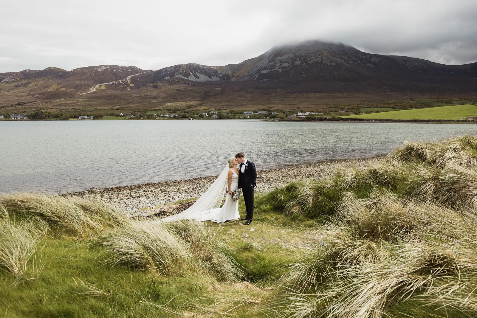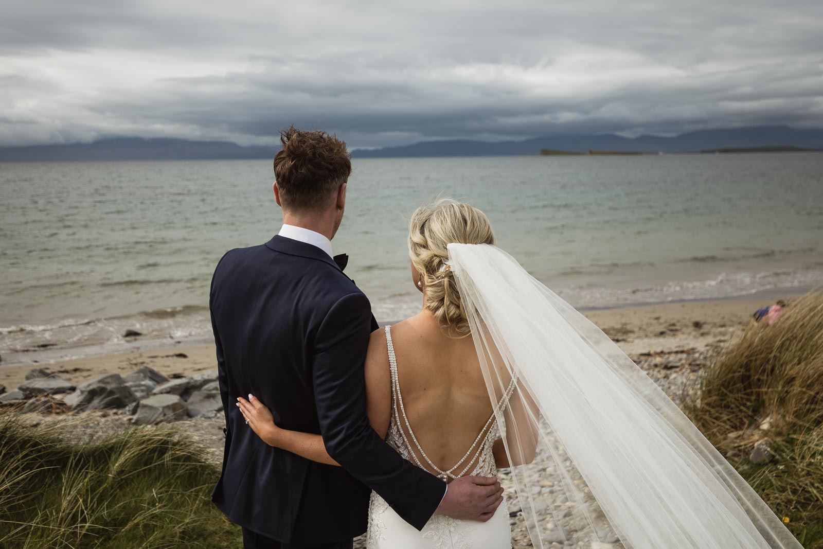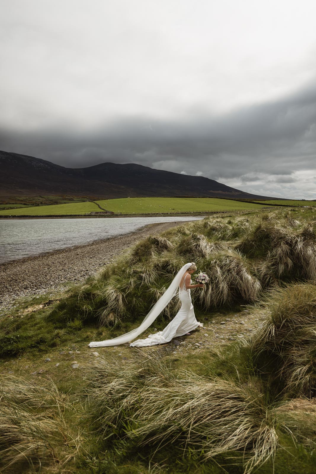 Post-ceremony, Fionnuala and Padraig returned home briefly to include their two cherished dogs in some photographs. The couple then journeyed to Bertra Beach, near Westport in County Mayo, in a vintage open-roof maroon Citroën 2CV6 Charleston. The picturesque setting of sand dunes, ocean vistas, and distant mountains provided a breathtaking backdrop for their photoshoot.