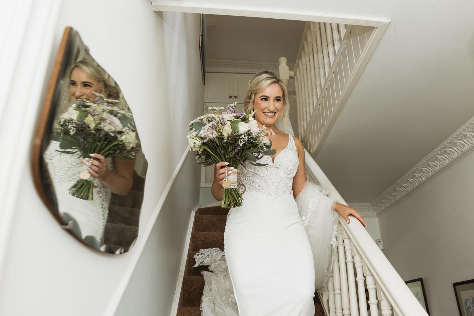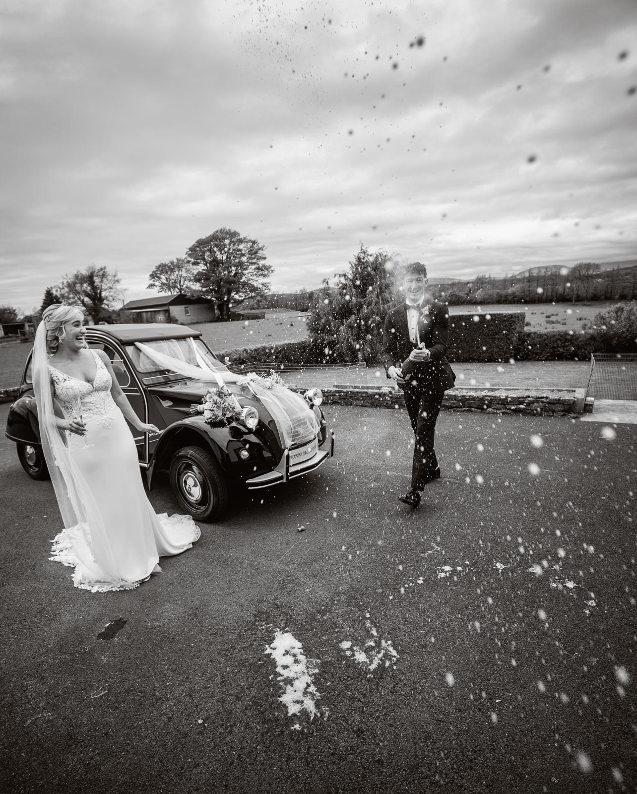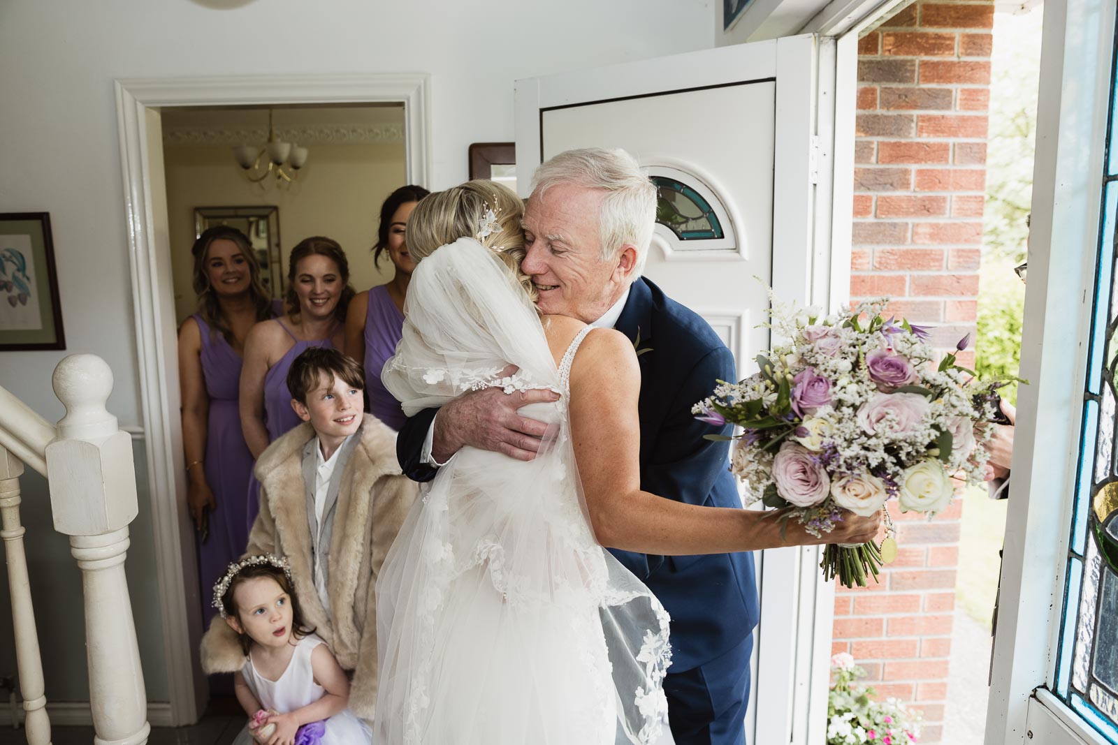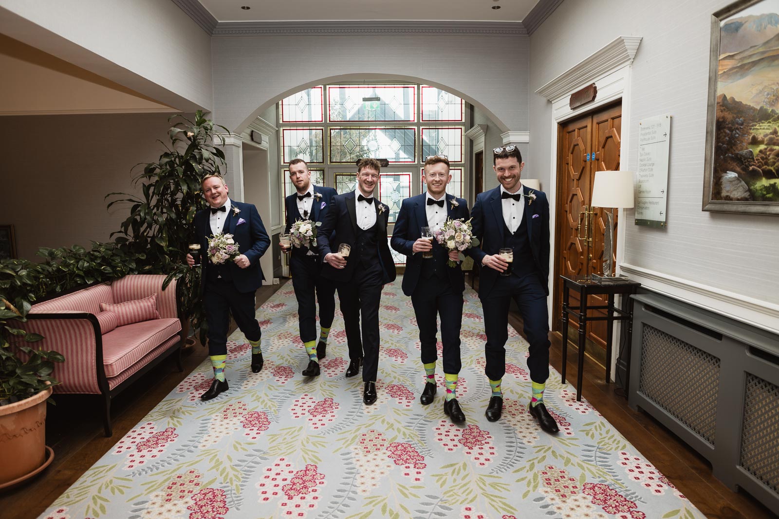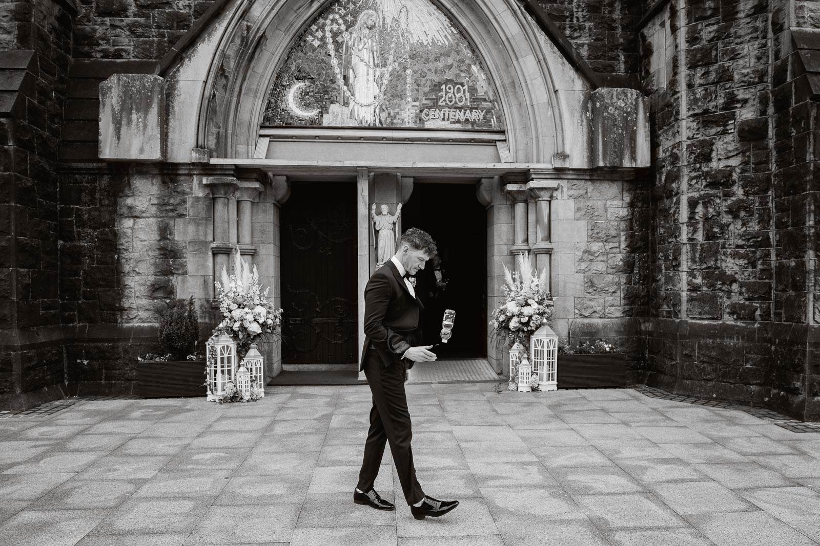 The day began with a delightful surprise – a playful baby lamb jumping around on the lawn beside Padraig’s family home. Capturing candid moments, I photographed Padraig and his groomsmen as they prepared for the day, sharing a sneaky shot of whiskey to steady any nerves. Meanwhile, at Fionnuala’s house, a relaxed atmosphere prevailed. Her beloved dog joined in the fun, playfully jumping in the back garden and even participating in the ‘Cham – Champ ‘ photos with the bridesmaids.