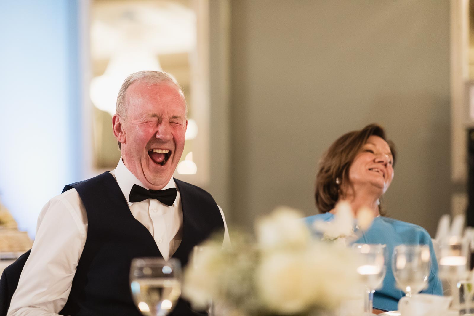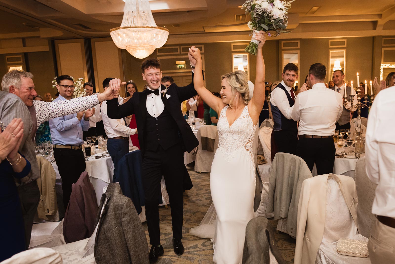 Making a memorable entrance, the couple arrived at Knockranny House Hotel standing in their vintage car, greeted enthusiastically by their bridal party assembled on the hotel’s steps. Situated on the outskirts of Westport, the hotel offers luxurious accommodations with panoramic views of Clew Bay and Croagh Patrick. We captured a few quick shots of the newlyweds on the hotel grounds, with the majestic Croagh Patrick as a backdrop, before proceeding to the dinner reception.