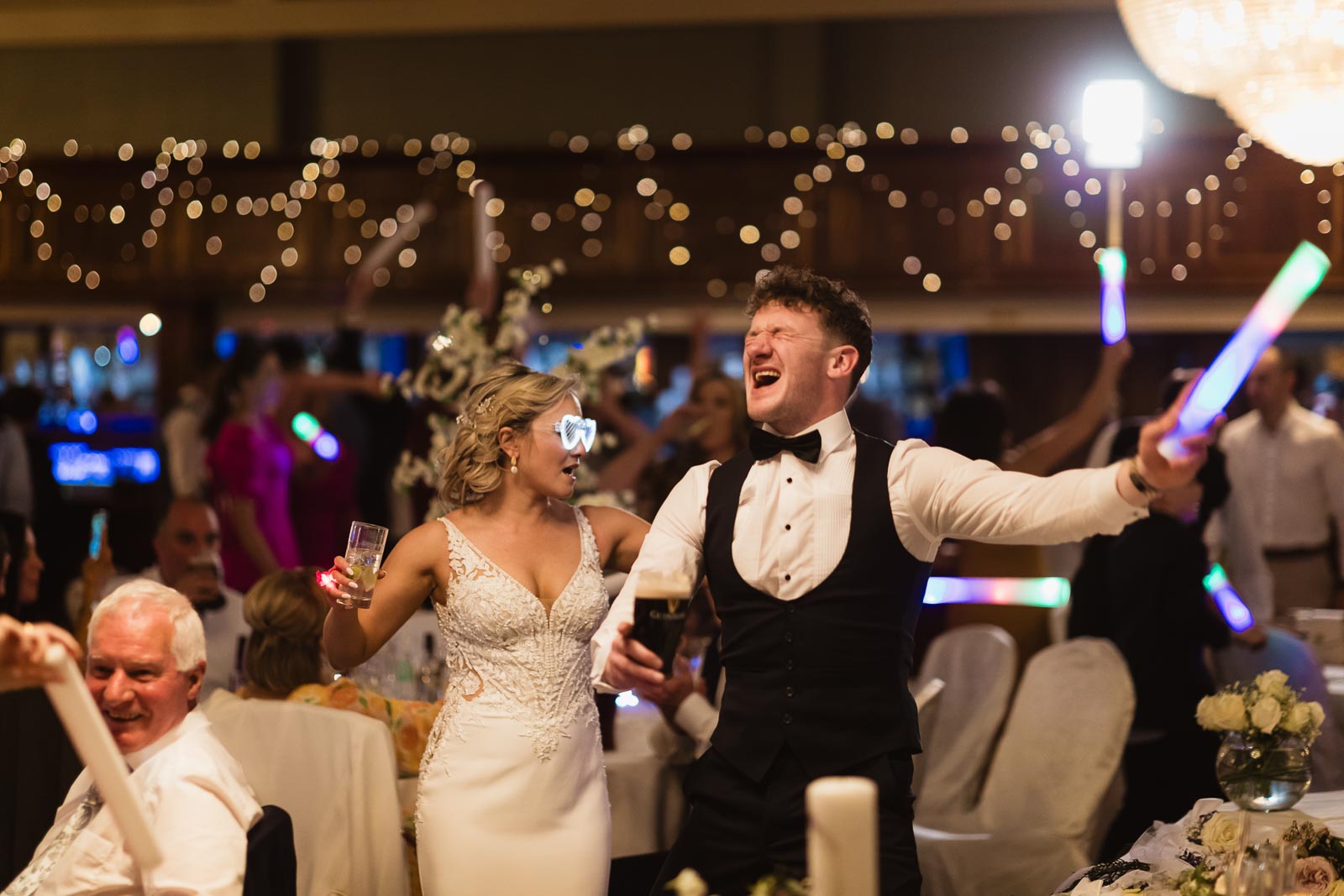 The evening was marked by heartfelt speeches, laughter, and a palpable sense of joy among family and friends. The dance floor buzzed with energy, as guests donned glow sticks and glasses, dancing on chairs to the vibrant tunes of the Bumblebee Honey Band.