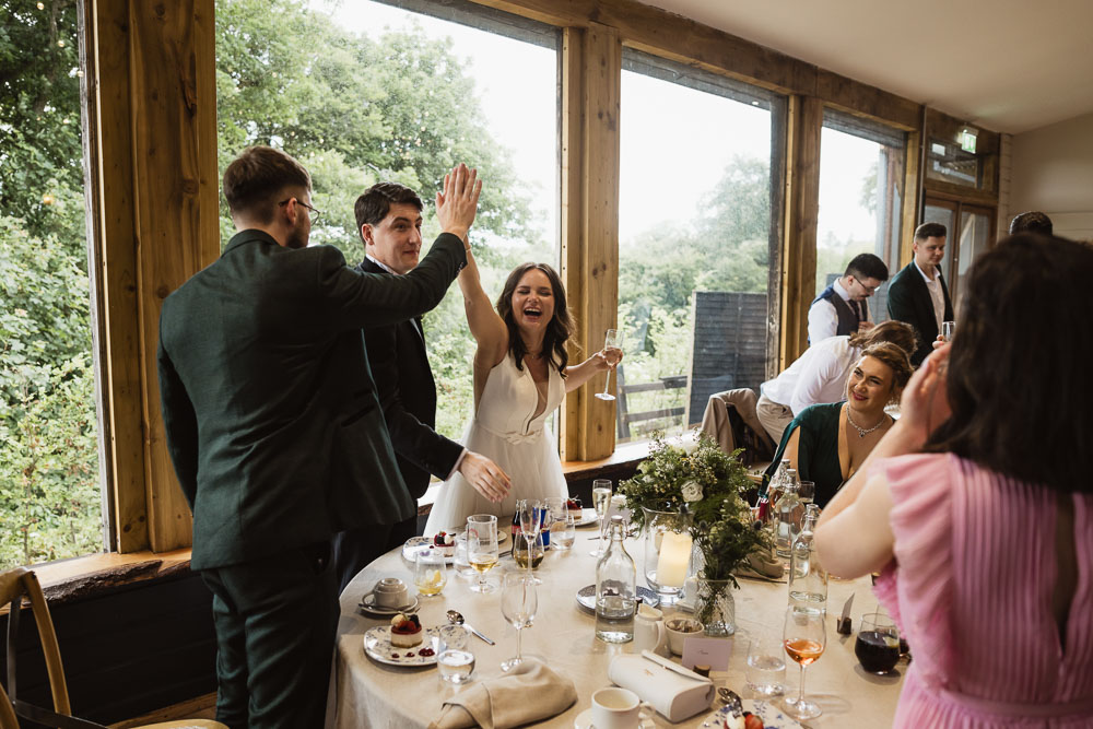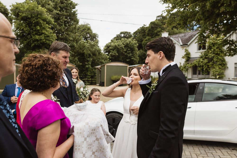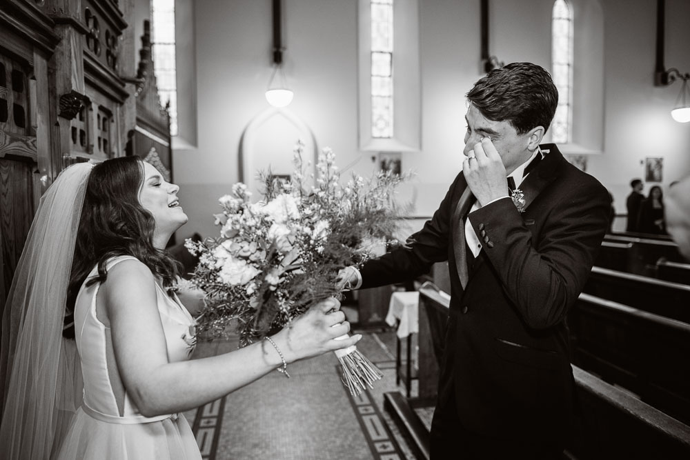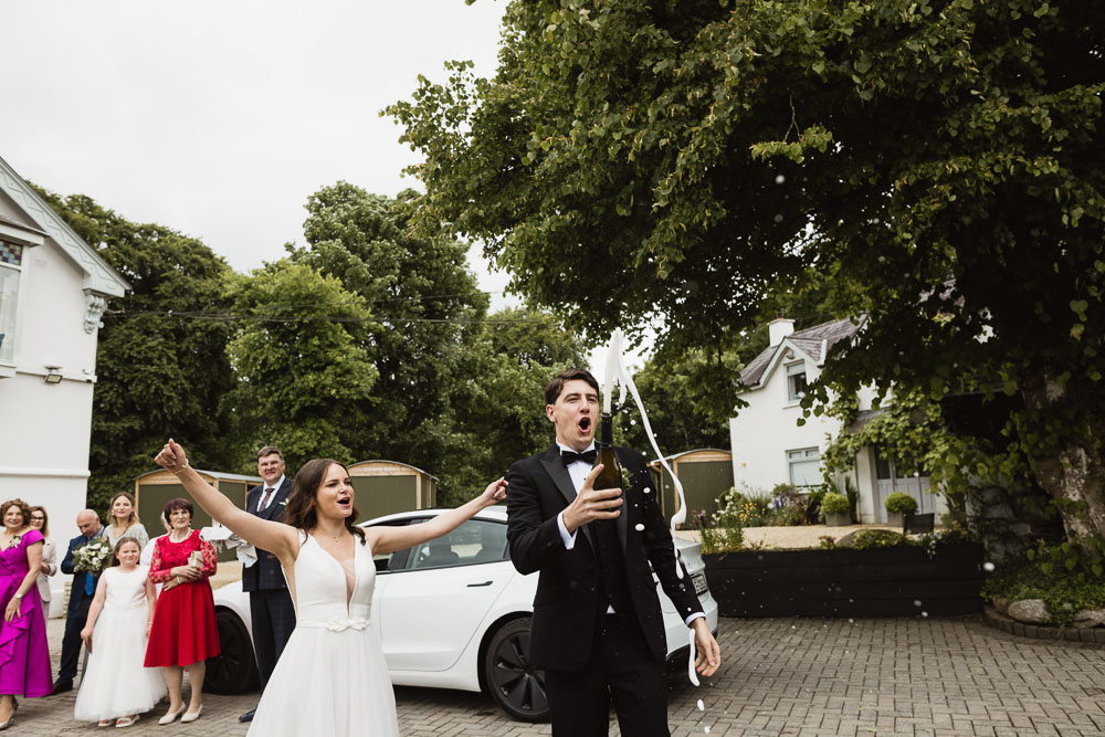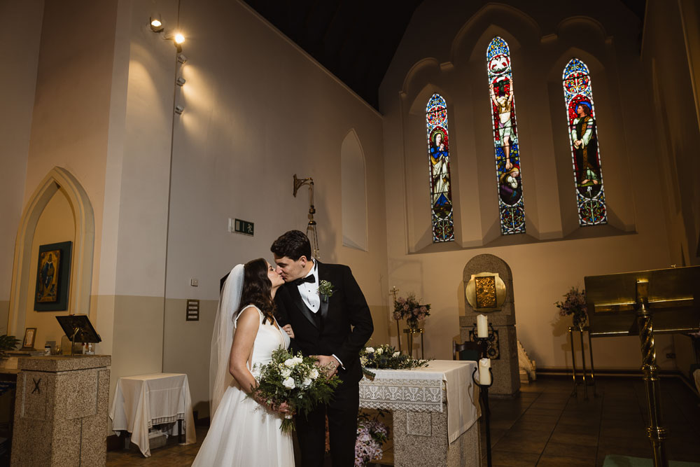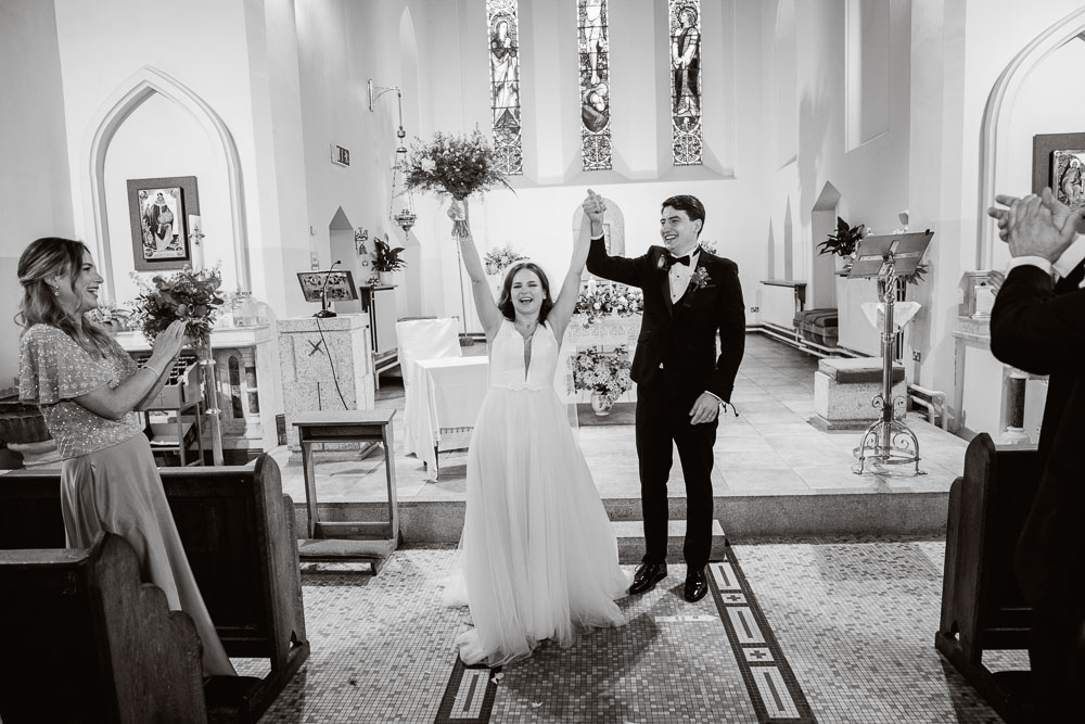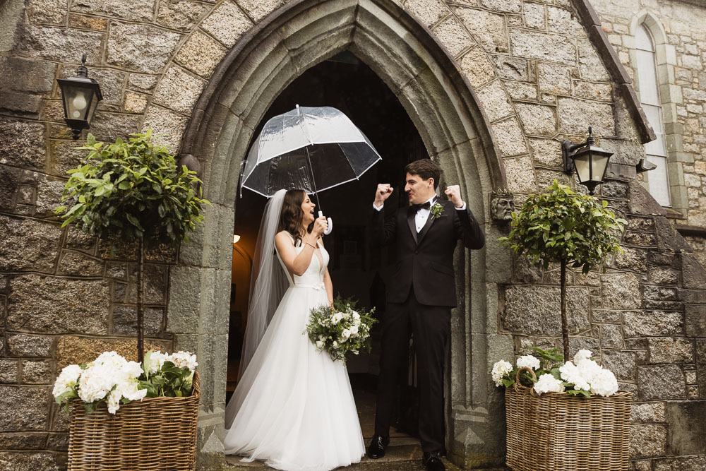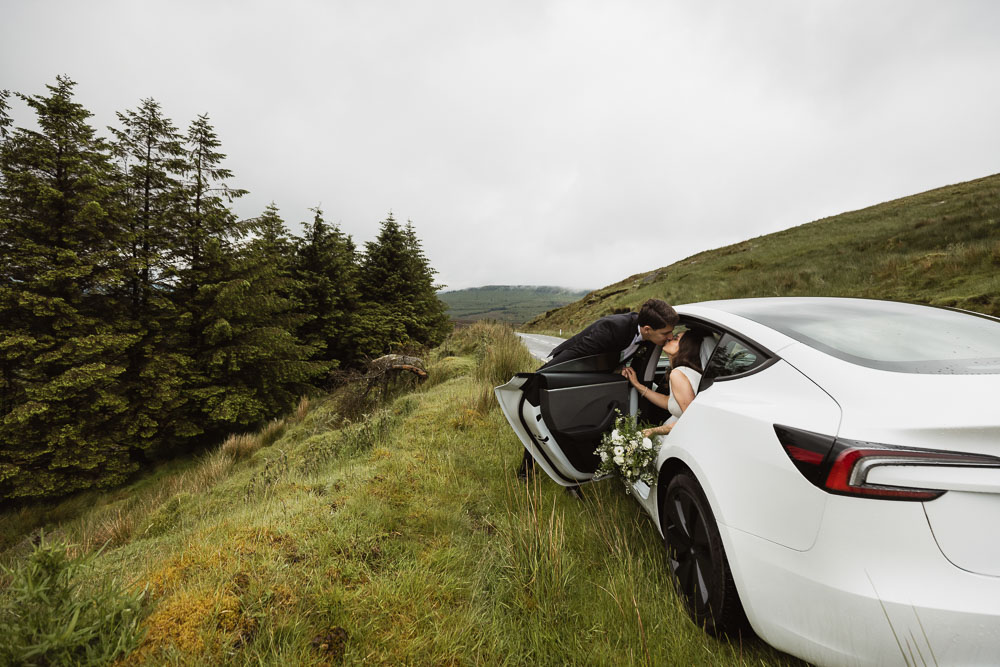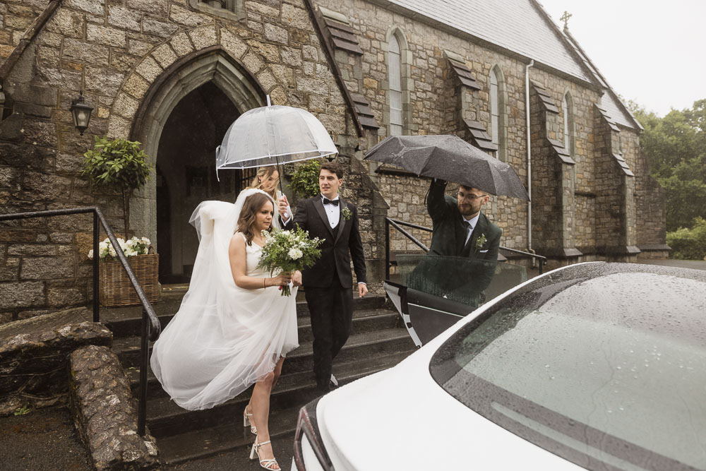 We had a bit of fun running through the rain to the Tesla wedding car, heading towards the beautiful St. Kevin’s Church in Laragh, Co. Wicklow. The stunning landscape surrounding the church made the rain seem like a distant memory as we arrived mostly dry inside.