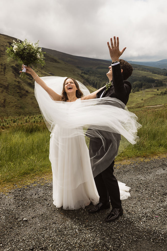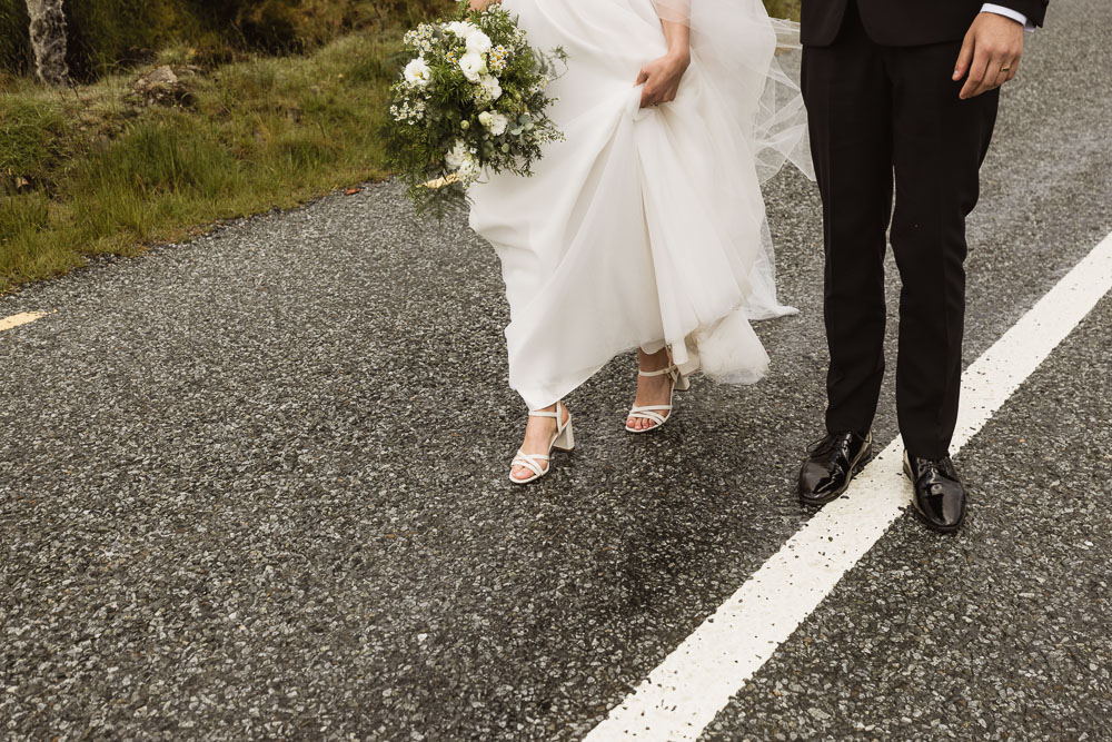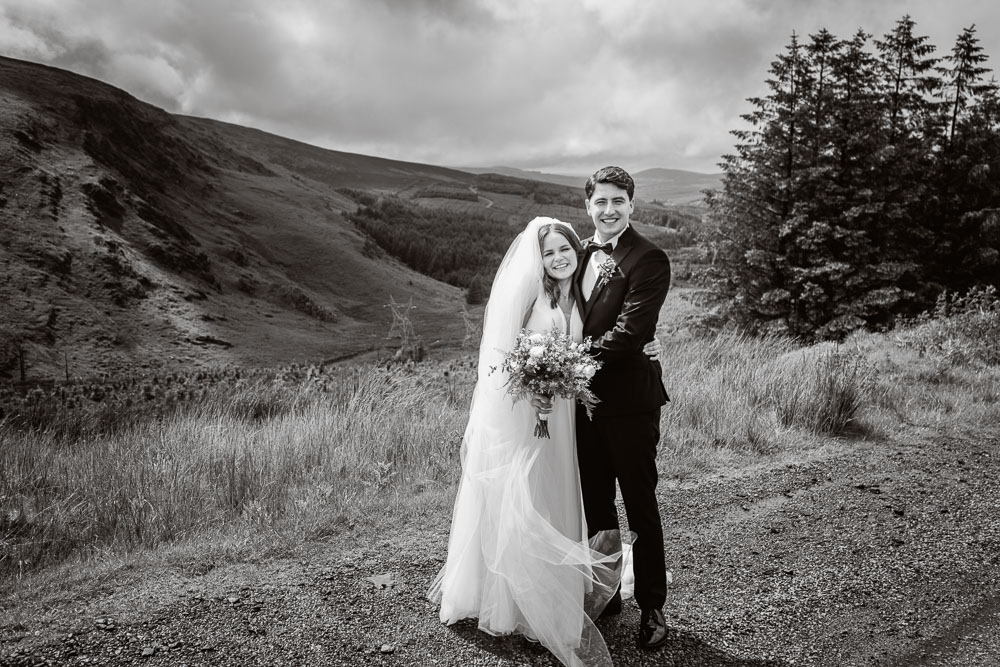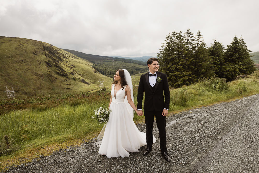 After the ceremony, the rain continued, and we weren’t sure if we could get any outdoor photos before heading to Poulaphouca House & Fallas. But, as it often happens in Ireland, the sun appeared just as we reached the top of the road, showcasing the beauty of Wicklow after the rain. We quickly captured a few stunning shots of the bride and groom before happily heading to the venue.
