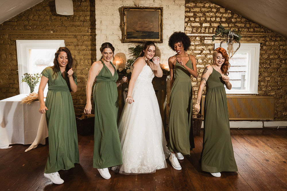 Bride and Groom chose a beautiful theme of olive green and gold for their wedding. The bridesmaids looked stunning in olive green dresses paired with comfortable white runners, adding a touch of casual elegance. The combination of earthy tones and soft gold accents created a warm and inviting atmosphere for the celebrations.